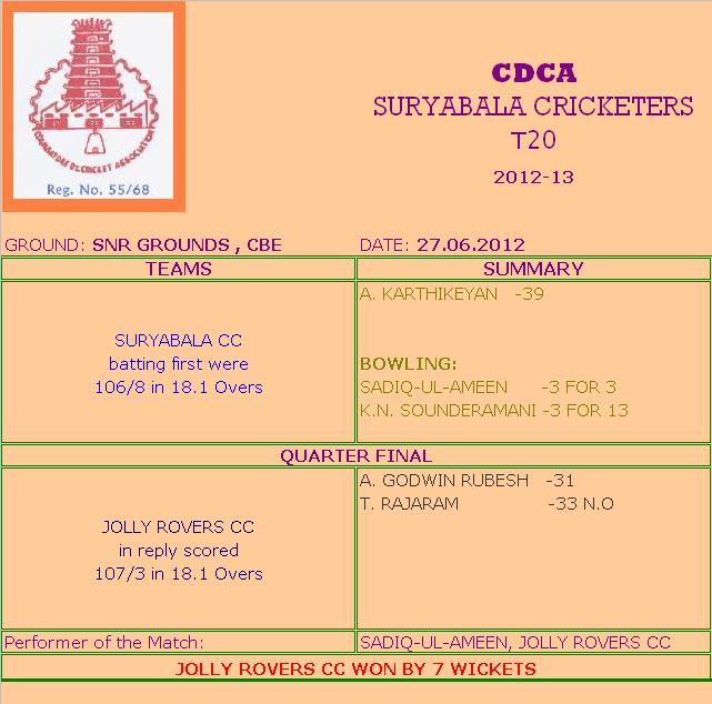 | On 27.06.2012, in the Coimbatore District Cricket Association – Suryabala Cricketers T20 tournament at SNR Grounds, Coimbatore, Suryabala CC 106/8 in 18.1 overs (A. Karthikeyan 39, M. Sadiq-Ul-Ameen 3/3, K. N. Sounderamani 3/13) Lost to Jolly Rovers CC CC 107/3 in 18.1 overs (A. Godwin Rubesh 31, T. Rajaram 33 not out). |