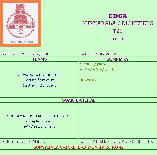 | On 27.06.2012, in the Coimbatore District Cricket Association – Suryabala Cricketers T20 tournament at PSG IMS, Coimbatore, Suryabala Cricketers 120/9 in 20 overs (R. Venkatesh 41, M. Shshjahan 31) Beat Sri Ramakrishna Cricket Trust 94/8 in 20 overs. |