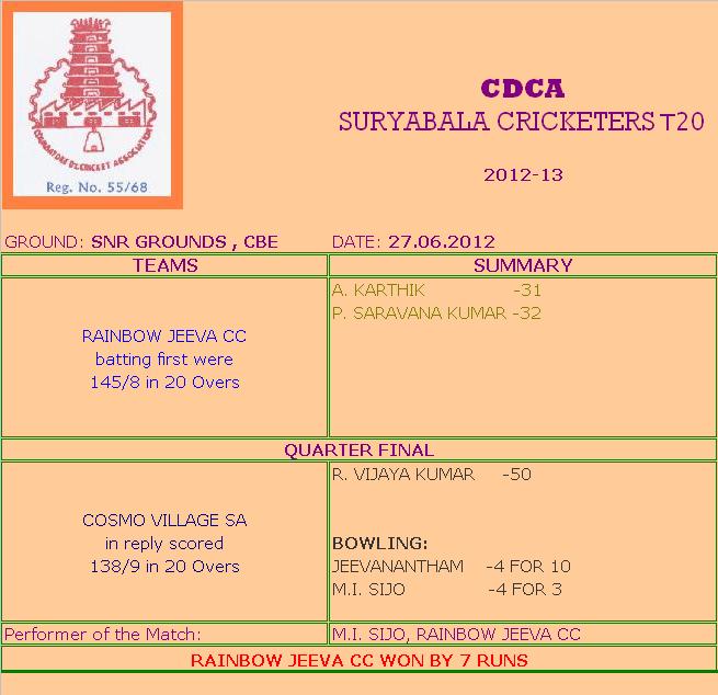 | On 27.06.2012, in the Coimbatore District Cricket Association – Suryabala Cricketers T20 tournament at SNR Grounds, Coimbatore, Rainbow Jeeva CC 145/8 in 20 overs (A. Karthik 31, P. Saravana Kumar 32) Beat Cosmo Vilage SA 138/9 in 20 overs (R. Vijaya Kumar 50, K. Jeevanantham 4/10, M. I. Sijo 4/3). |
