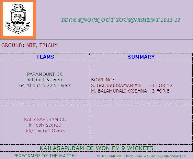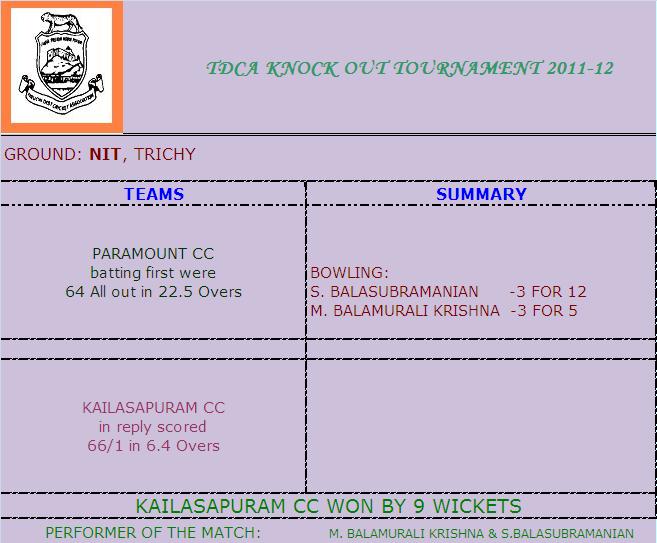 At National Institute of Technology (NIT), Paramount CC – 64 allout in 22.5 Overs ( S.Balasubramanian – 3 for 12, M.Balamurali Krishna – 3 for 5) lost to Kailasapuram CC – 66 for 1 in 6.4 Overs.