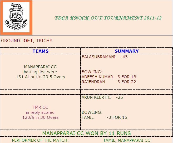 The following are the knock out match reports for qualifying to play in the Tiruchirappalli District Cricket Association’s (TNCA -TDCA) league played on 03.12.2011 and 04.12.2011 at Trichy in the grounds OFT.