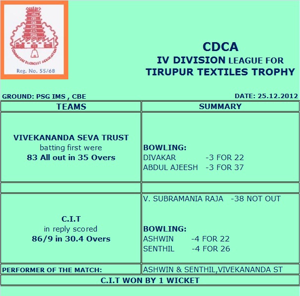 On 25.12.2012, in the Coimbatore District Cricket Association’s IV Division League for Tirupur Textiles Trophy (TNCA- CDCA), at PSG IMS grounds, VIVEKANANDA Seva Trust 83 in 35 overs (DIVAKAR 3/22 , ABDUL AJEESH 3/37) ‘lost to’ C.I.T 86/9 in 30.4 overs (V.SUBRAMANIA RAJA 38*, ASHWIN 4/22 ,SENTHIL 4/26).